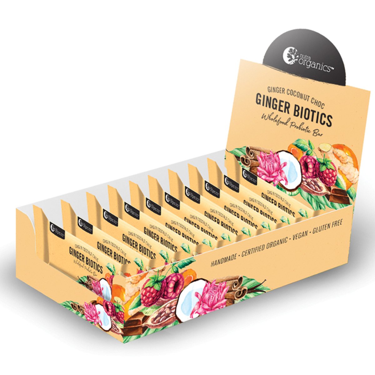 Nutra Organics Organic Wholefood Probiotic Bar Ginger Biotics (Ginger Coconut Choc) 45g x 12 Disp