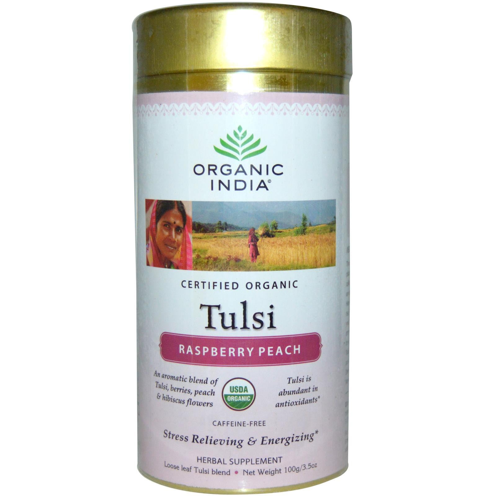 Organic India Loose Leaf Tulsi Blend Tea Raspberry Peach Caffeine Free 100g