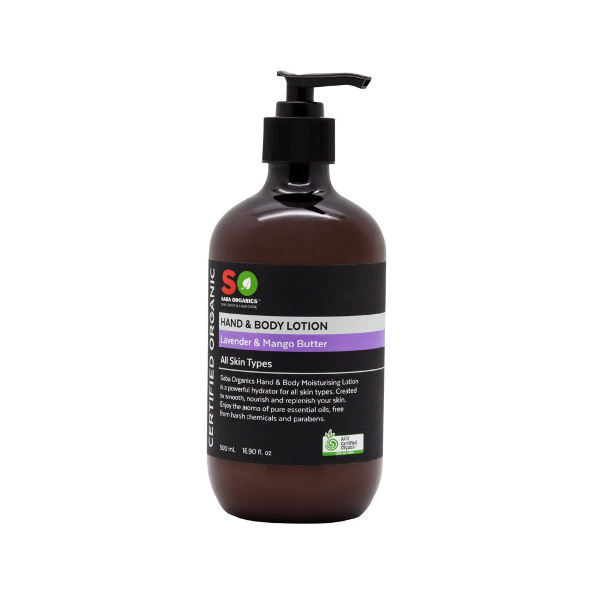Saba Organics Certified Organic Hand & Body Lotion Lavender & Mango Butter 500ml