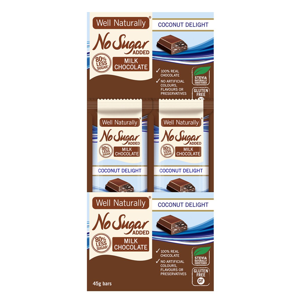 Well Naturally No Added Sugar Bar Milk Chocolate Coconut Delight 45g x 16 Display